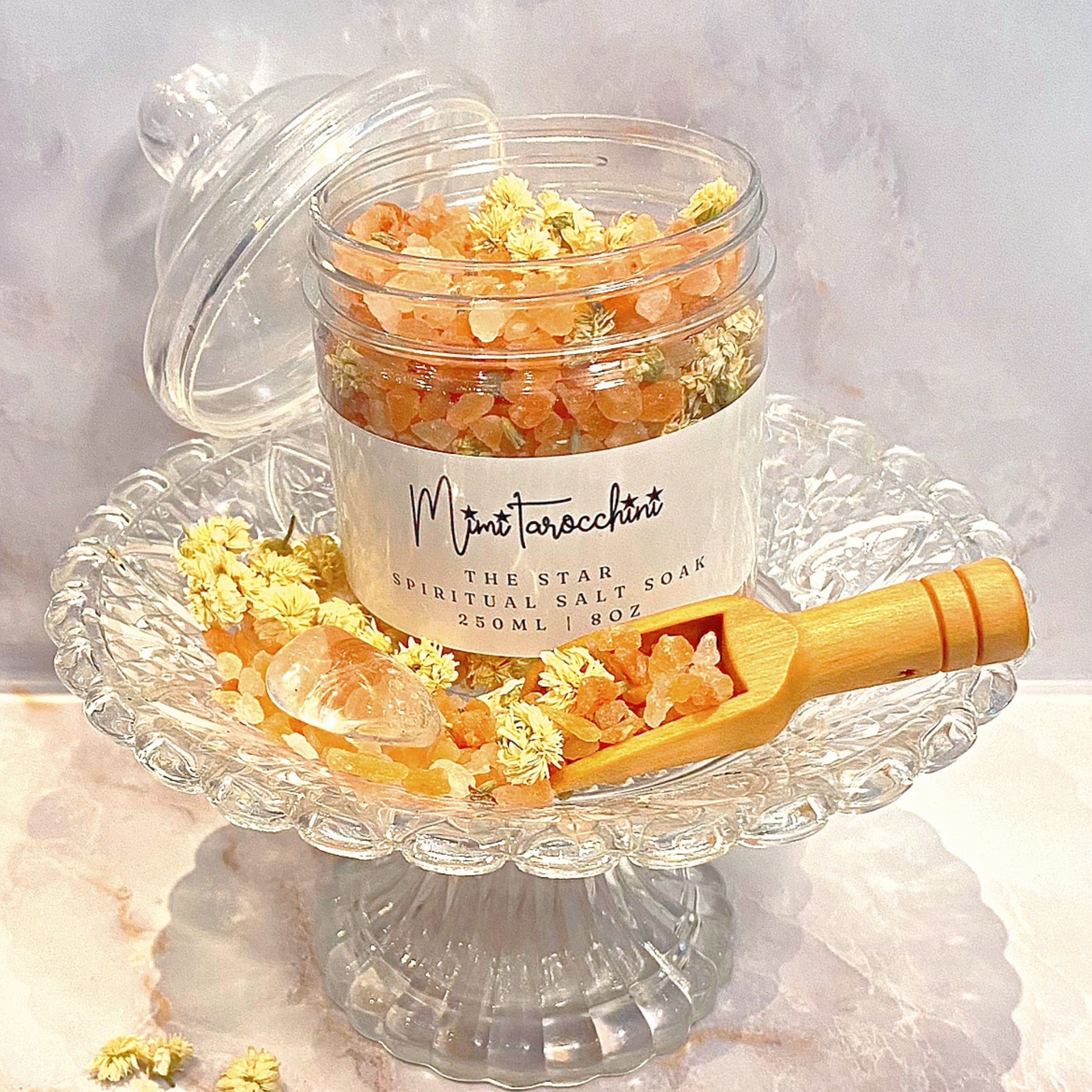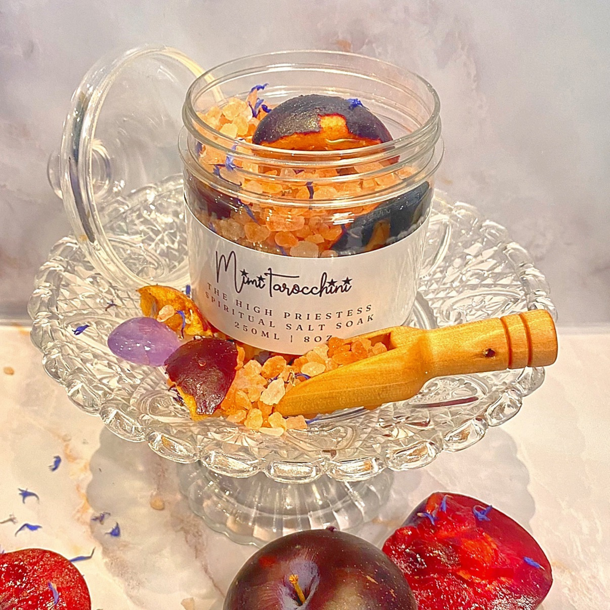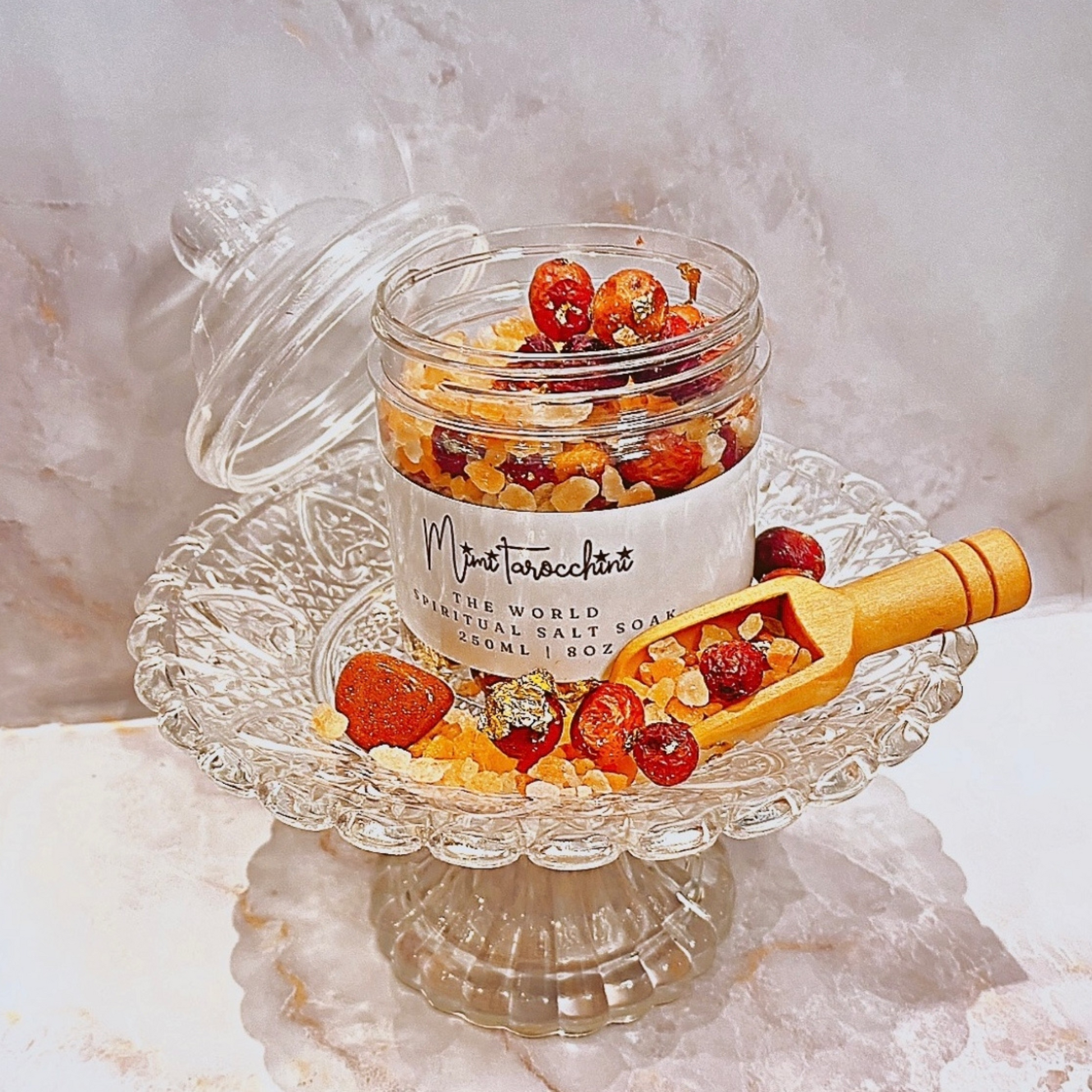Based on the major arcana of the tarot, these vegan, cruelty-free, and natural creations feature 250ml of bath salts, essential oils, dried botanicals, and a crystal to charge the contents. All bath salts also come with a wooden scoop.