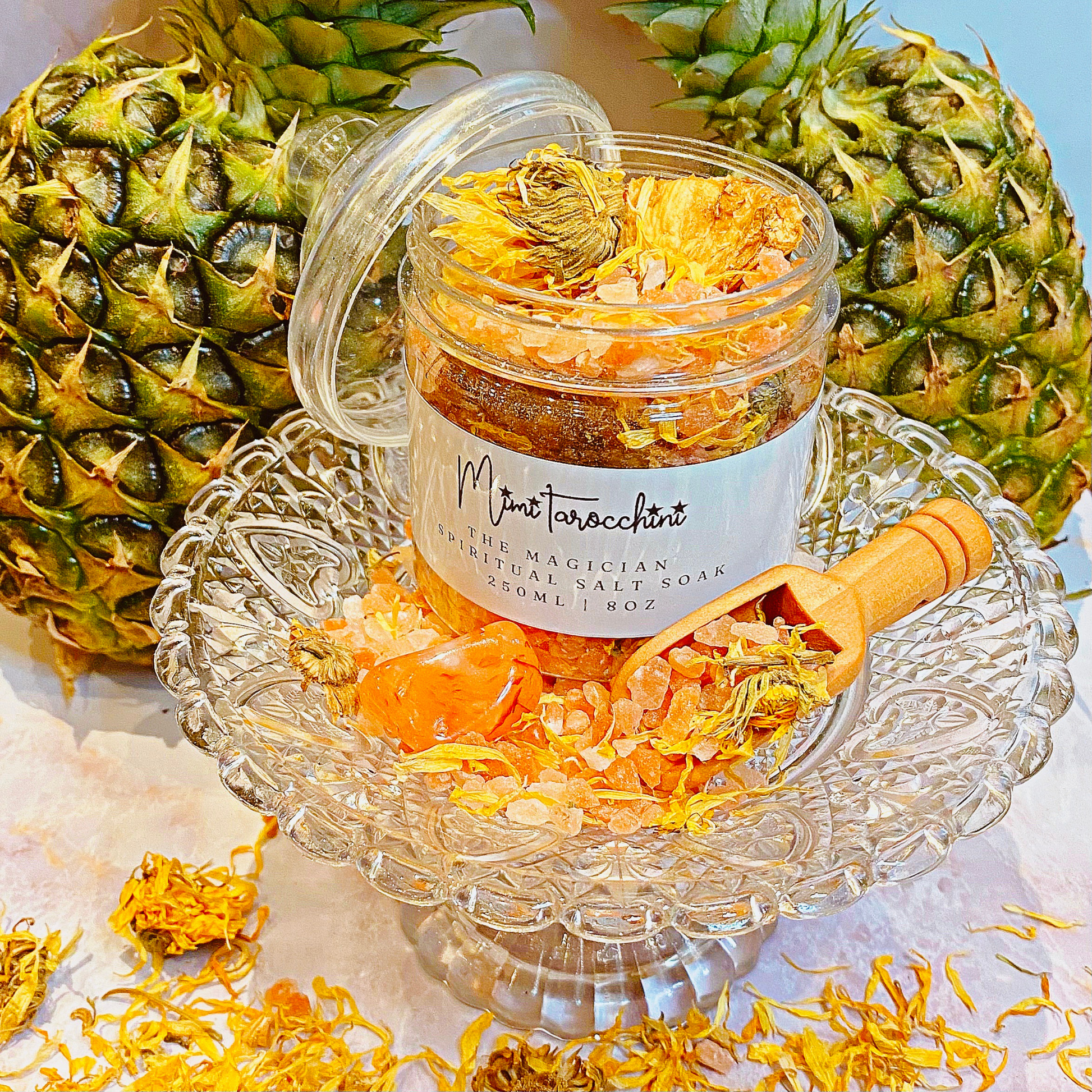 Aids manifestation power, contains Mimi T salt blend, pineapple, calendula and a Carnelian Tumblestone.