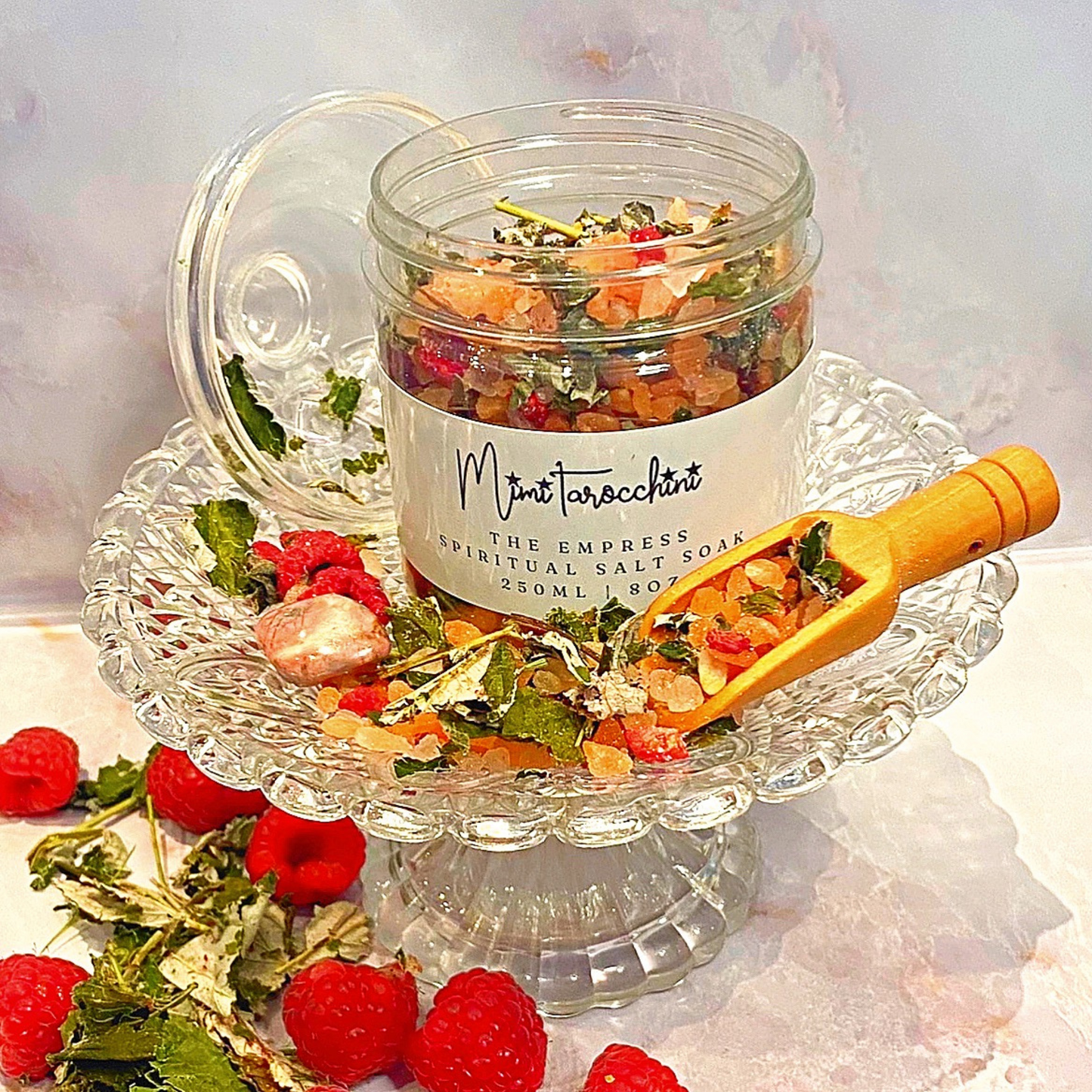 Aids divine feminine energy, contains Mimi T salt blend, Dried Raspberry, Dried Raspberry Leaf Tea, Peach blossom and a Rhodonite Tumblestone.
