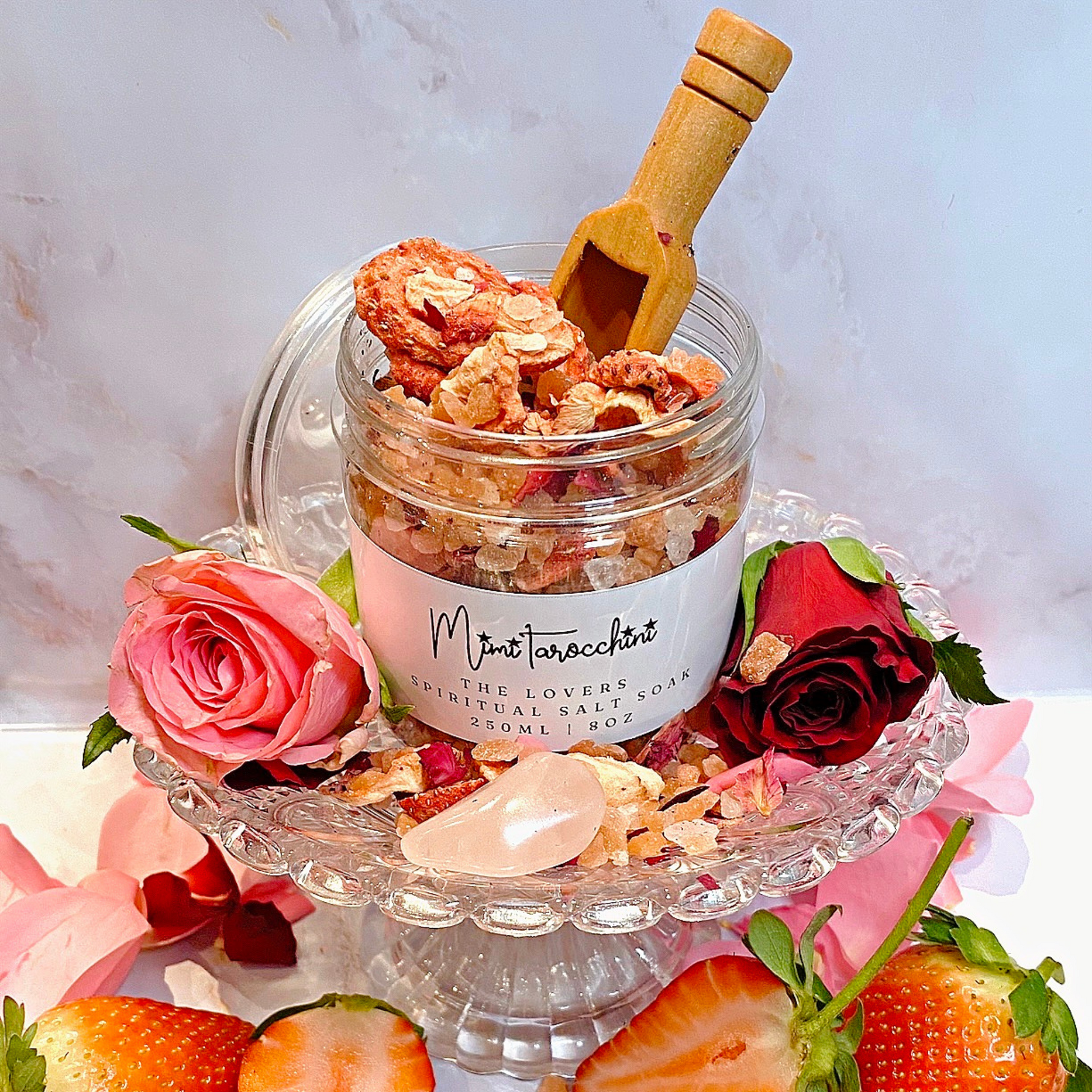 Attracts self-love, contains Mimi T salt blend, rose, brown sugar, strawberry and a Rose Quartz Tumblestone.